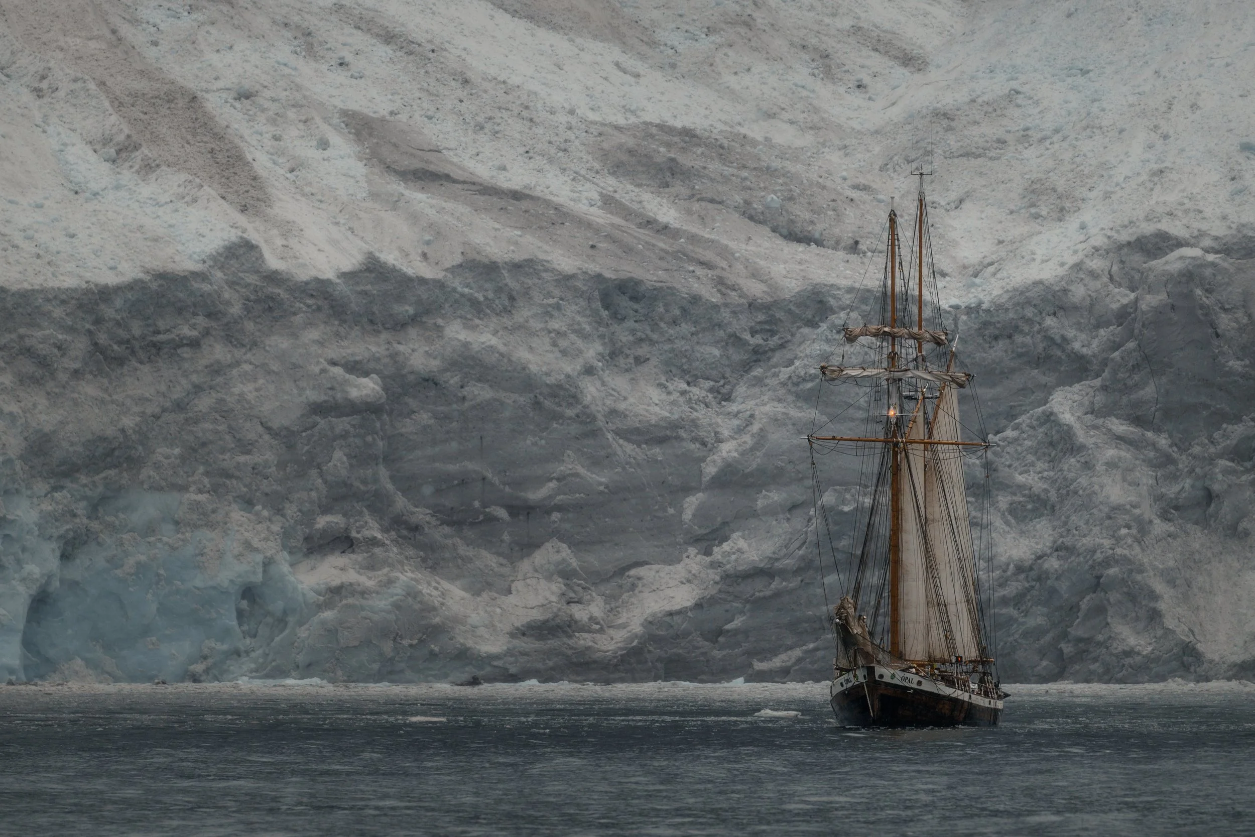 De volgende ochtend, de zesde alweer, ging het anker om 04:30 uur omhoog. Een lange dag zeilen lag voor de boeg, naar de Volquart Boons kust, met zwart gebergte ditmaals, richting de gigantische Sol Glacier. Vanaf daar een lange oversteek naar Ittoqqortoormiit. We stevenden af op een gebied met storm en regen. Langs de Volquart Boons kust tot aan de Sol Glacier was het aanvankelijk nog prima te doen. De Ópal zette alle zeilen op en dat was natuurlijk fantastisch om te zien en te fotograferen, al was het zicht beperkt en heiig, wat natuurlijk jammer was.